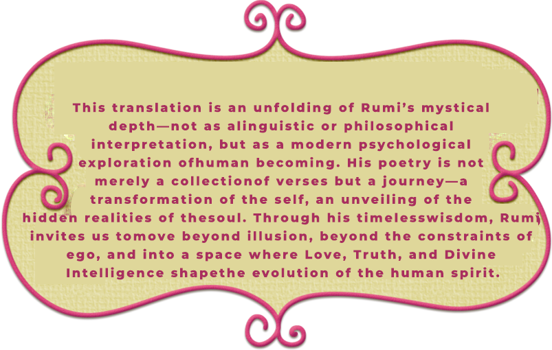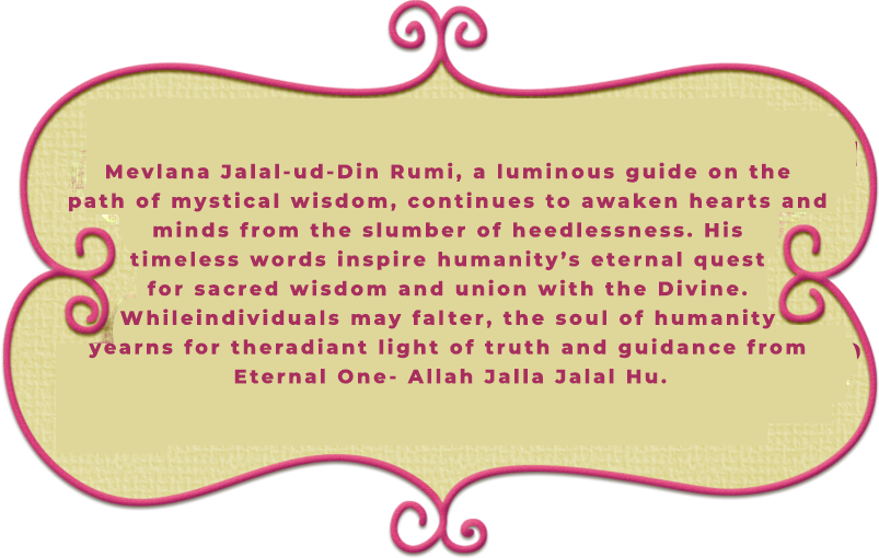 Rumi calls upon humanity to surrender to the Divine Order—not as a passive submission, but as a realization of a greater harmony that governs existence. The message of the Prophets—Buddha, Jesus (PBUH), and Prophet Muhammad (SAW)—has been one and the same: to enjoin good and forbid evil. Though the paths may differ, the ultimate destination remains unchanged—peace, unity, and the unfolding of divine virtues in the human heart. Where human reasoning reaches its limits, the radiance of Divine Intelligence begins, guiding us beyond the seen into eternal mysteries. Through his timeless poetry and storytelling, Rumi invites us to step into this sacred wisdom—to let go of the illusions that bind us and embrace the boundless love that sets the soul free.